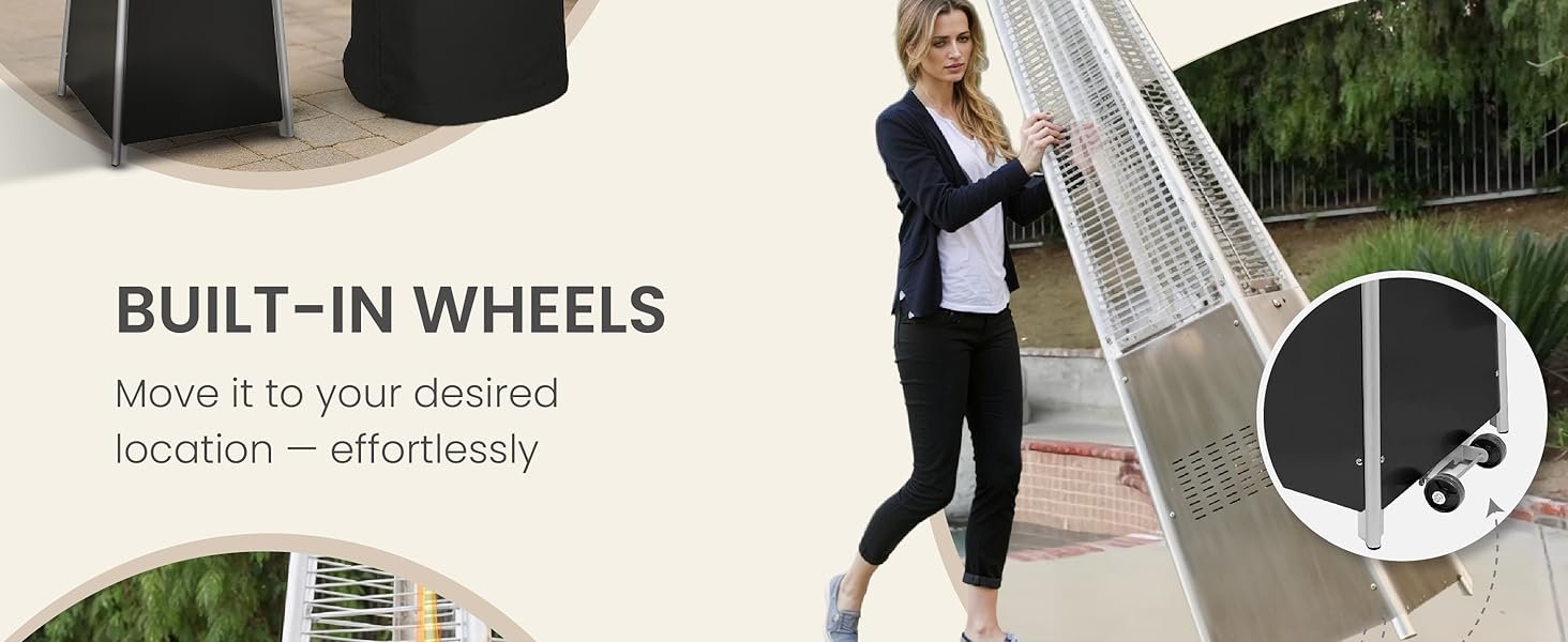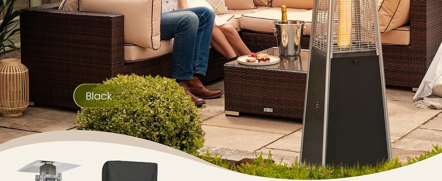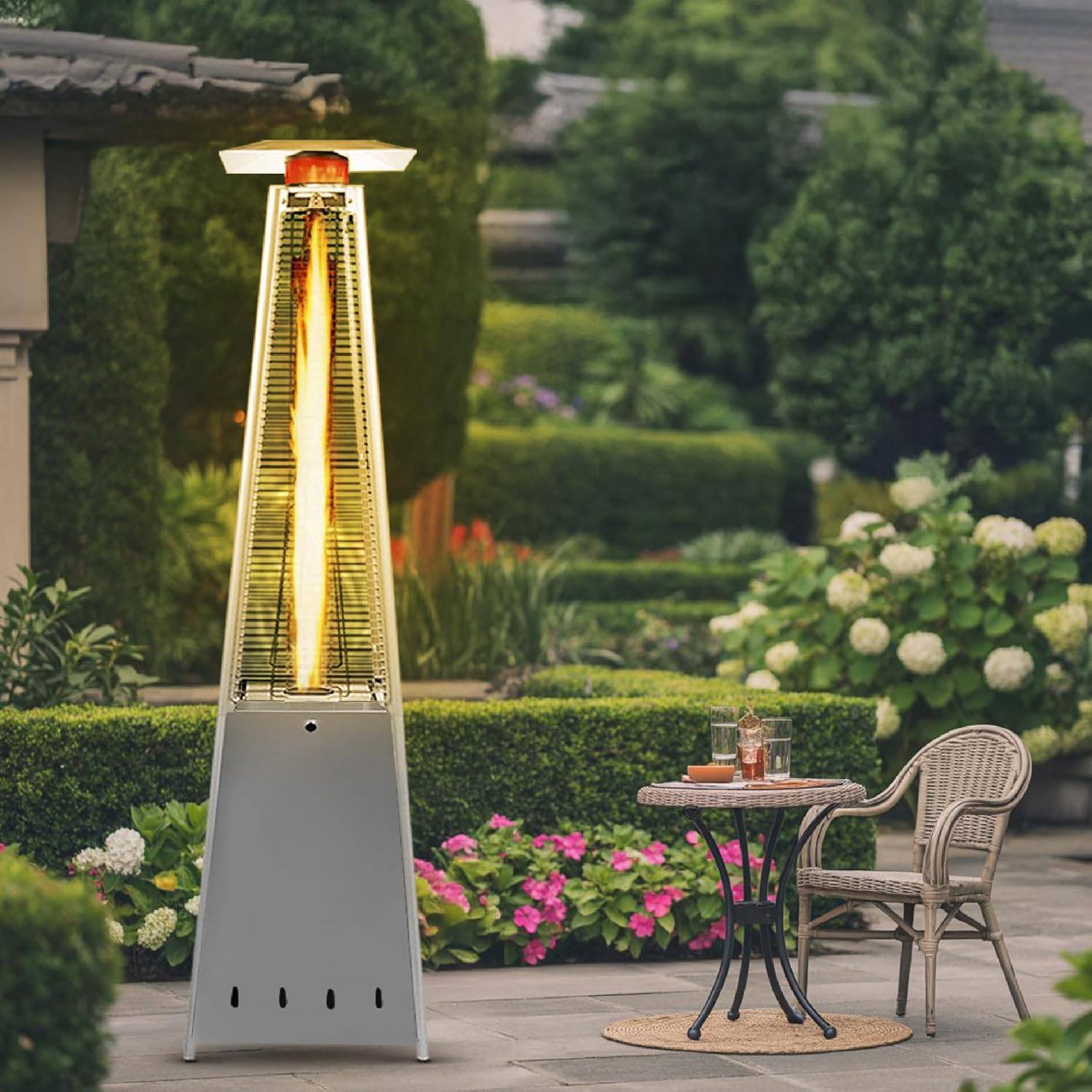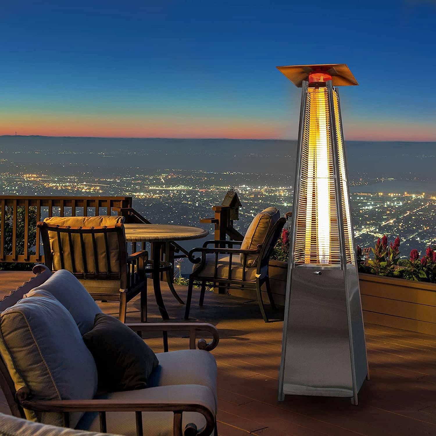- 🔥 EFFICIENT HEATING – This pyramid-shaped outdoor heater is powered by propane gas and displays an attractive open flame safely contained in a quartz glass tube. Its column design and pagoda-shaped reflector atop the unit helps maximum heat and warmth radiate and spread out over a 10-foot radius.