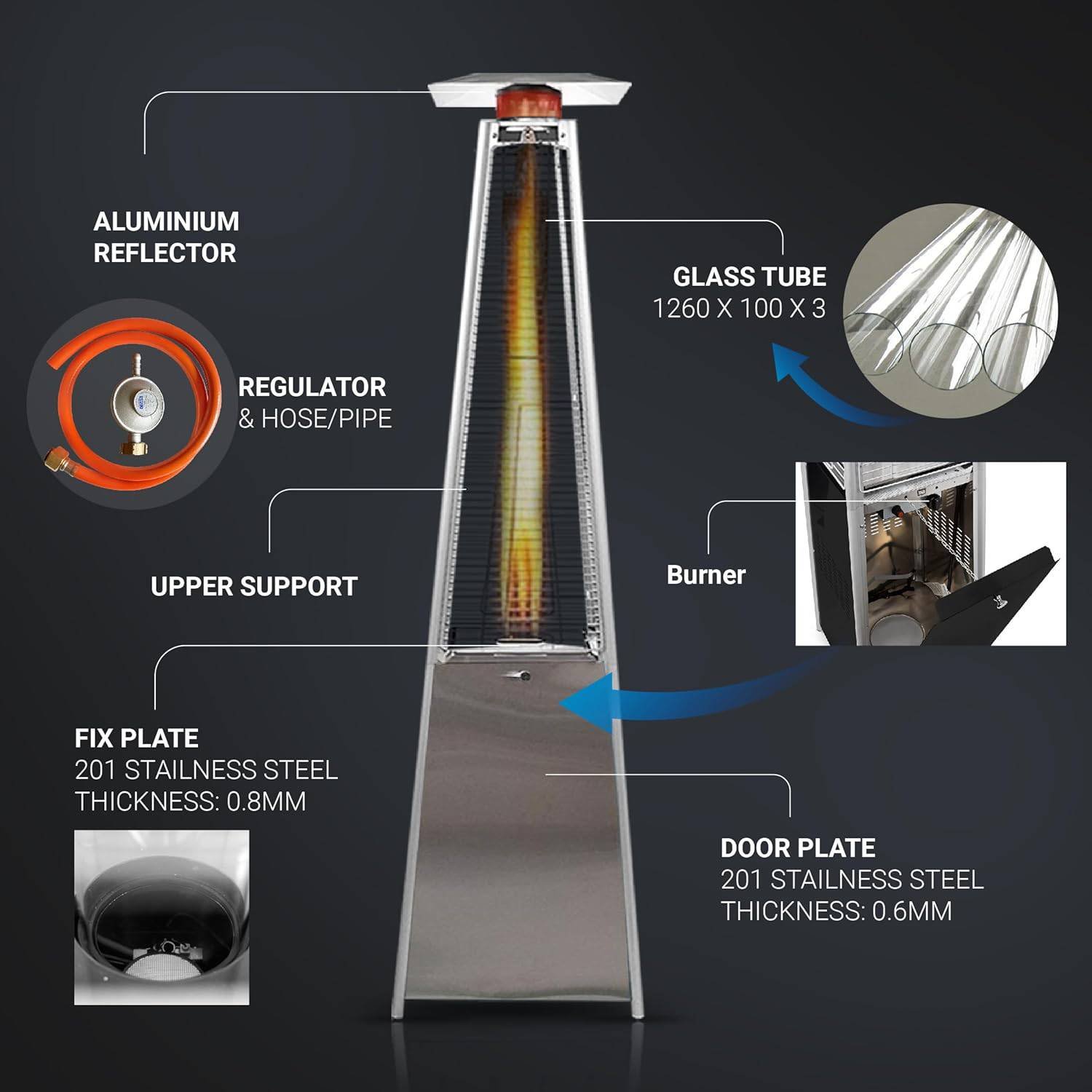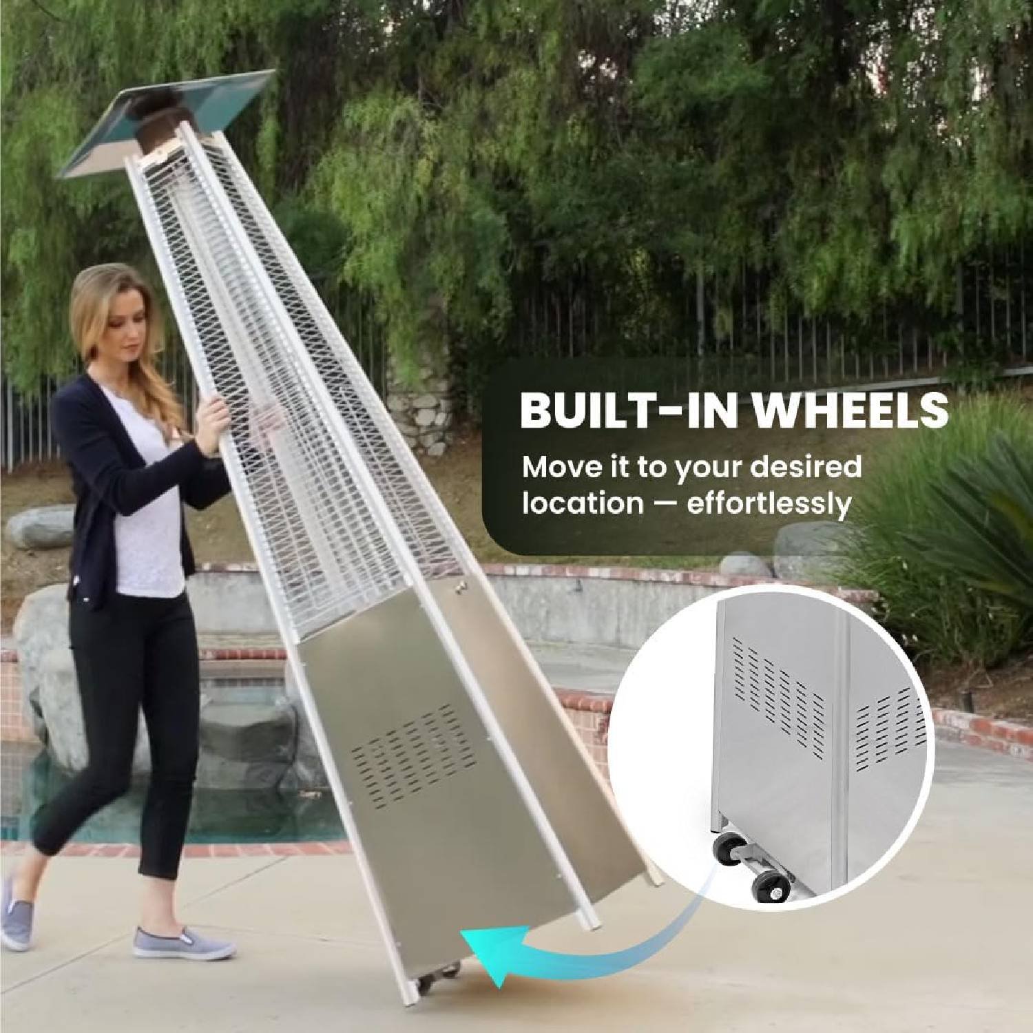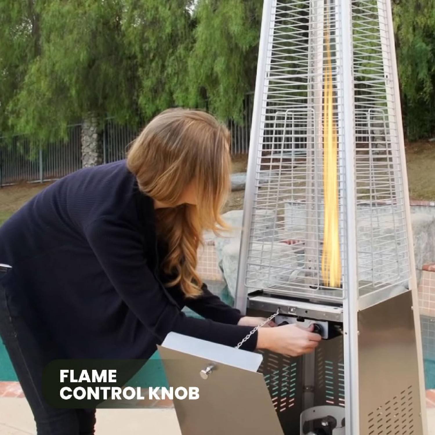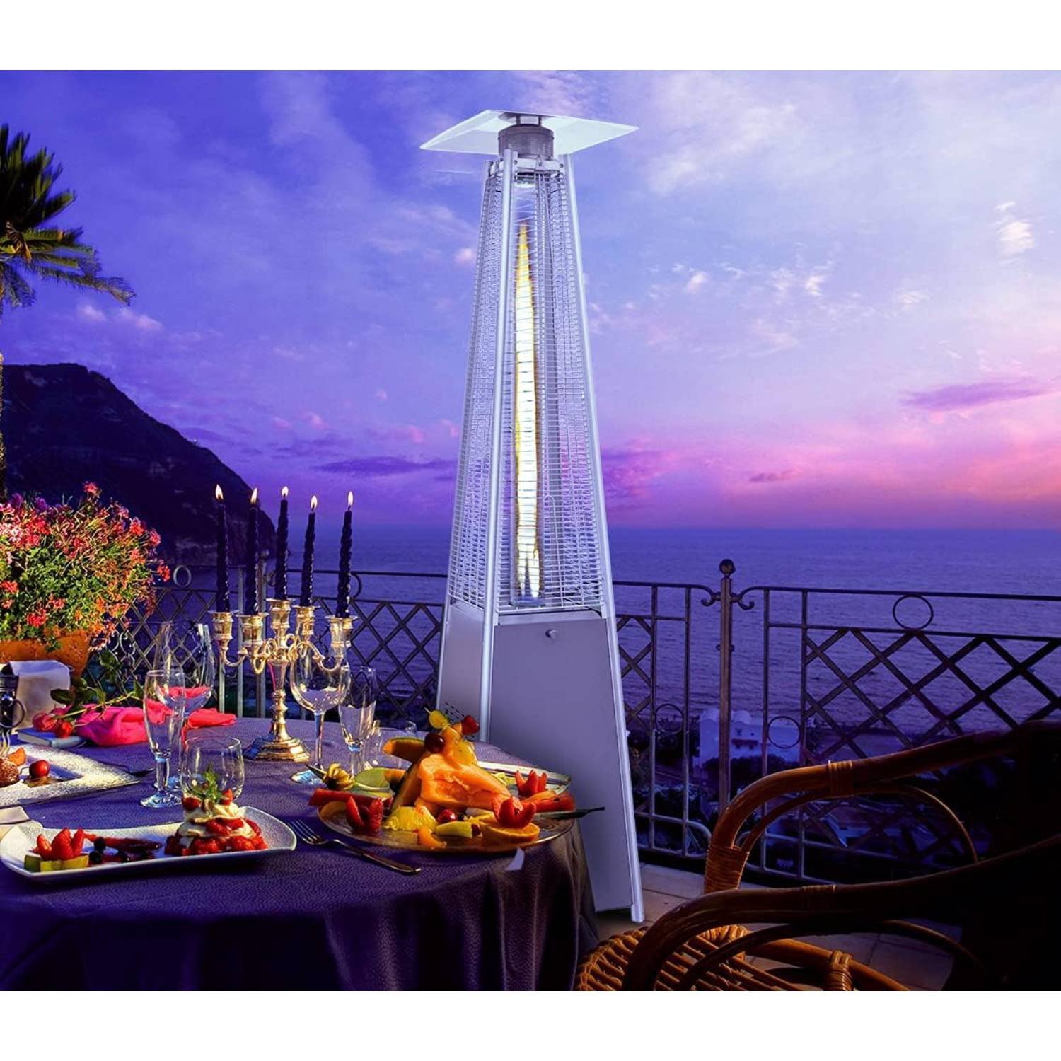 - 🔥 EFFICIENT HEATING – This pyramid-shaped outdoor heater is powered by propane gas and displays an attractive open flame safely contained in a quartz glass tube. Its column design and pagoda-shaped reflector atop the unit helps maximum heat and warmth radiate and spread out over a 10-foot radius.