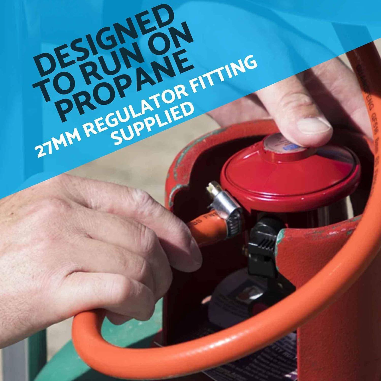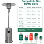 - Easy Manoeuvrability – Supplied with wheels and has some simple assembly required. Dimensions (W x H): 85 x 220cm. Maximum Gas Bottle Size (W x H): Ø32.5 x 70cm. Supplied with 27mm regulator and hose assembly for use with propane patio gas bottles. Supplied with weatherproof, water-resistant cover.