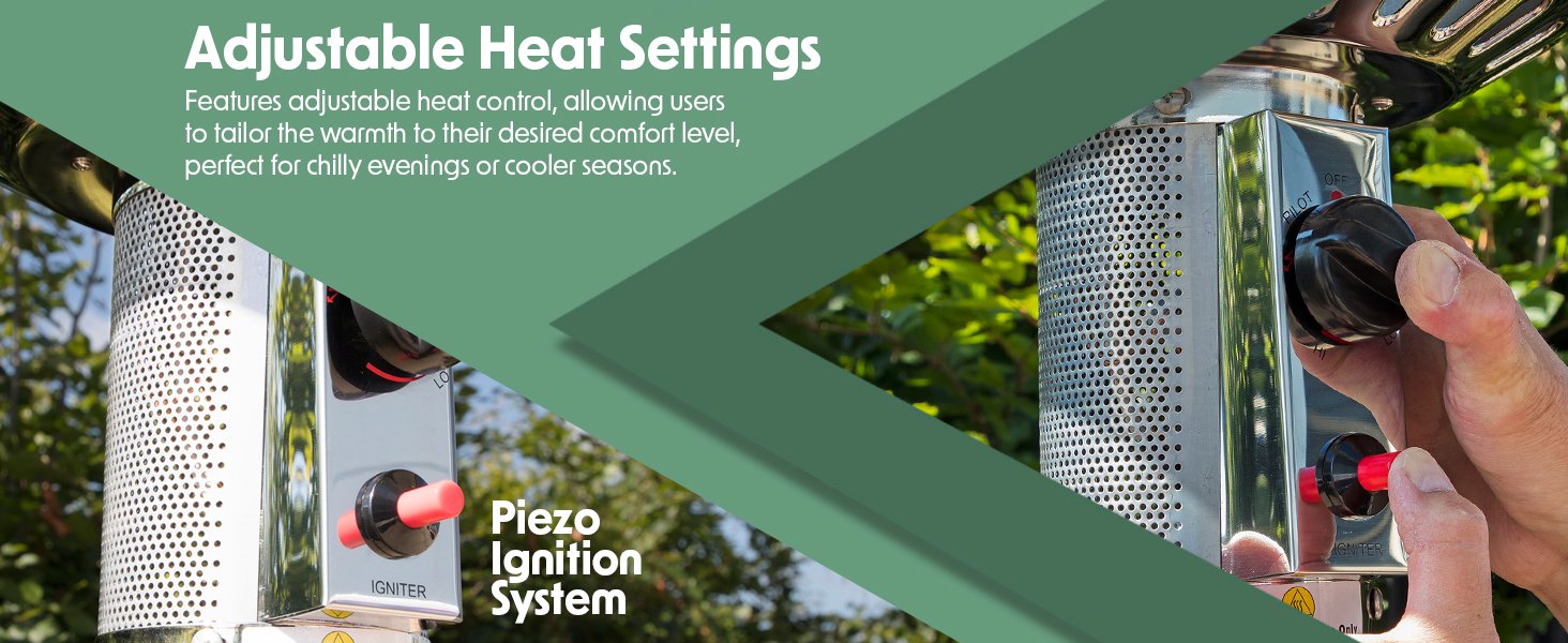 - Adjustable Heat – Variable temperature output controls and a fully enclosed propane gas cylinder chamber with safety tip over switch.
