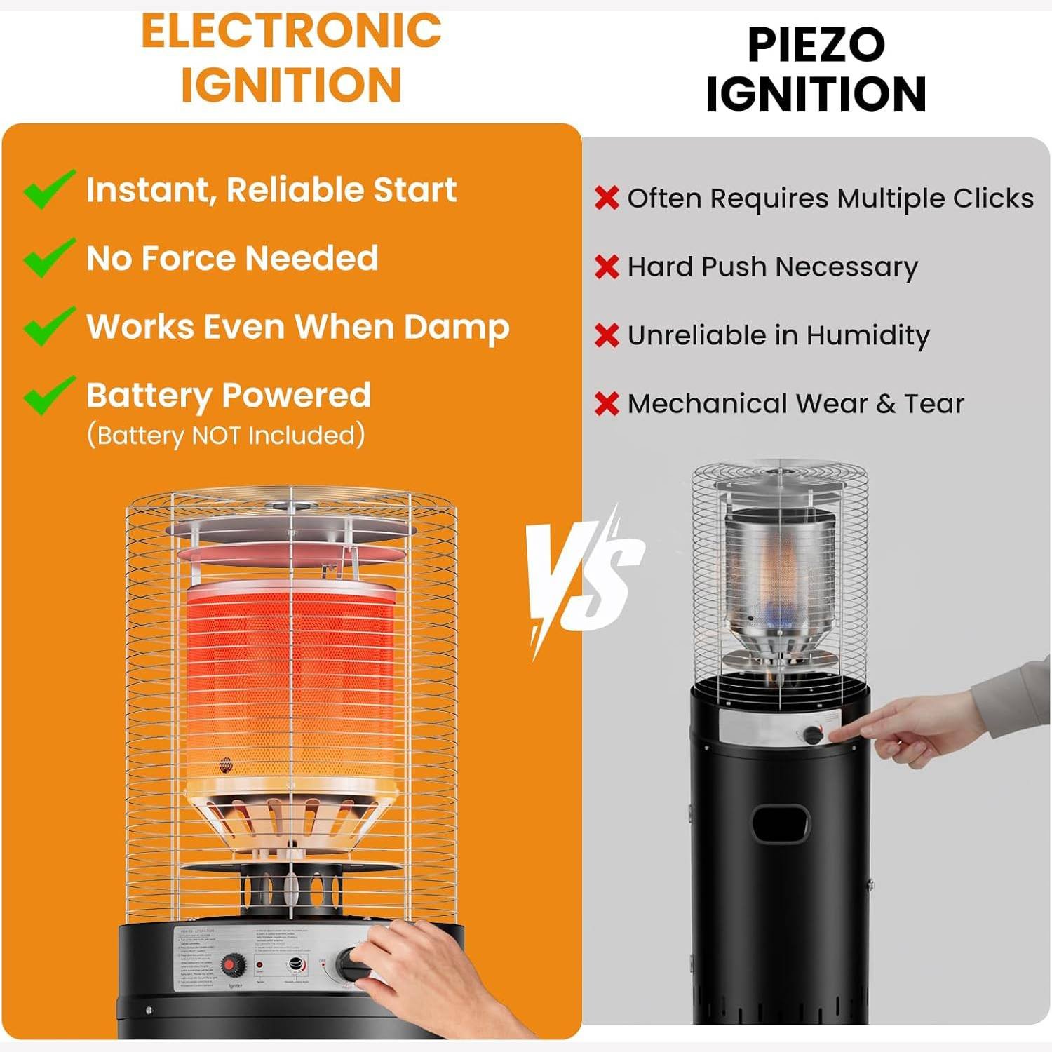 - Quick Assembly, Instant Heat : Get your heater ready in minutes with our clear Instruction Manual. Enjoy ultimate convenience with battery-powered electronic ignition (battery not included) – no matches or lighters needed. Designed for standard UK patio gas cylinders (compatible with 6kg & 13kg sizes), this heater delivers immediate warmth for any outdoor space.