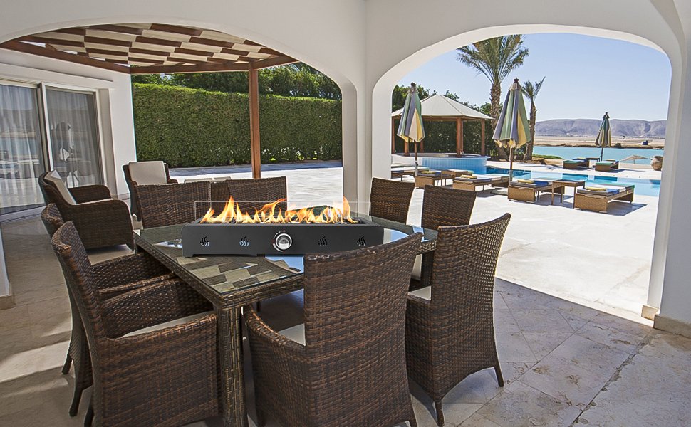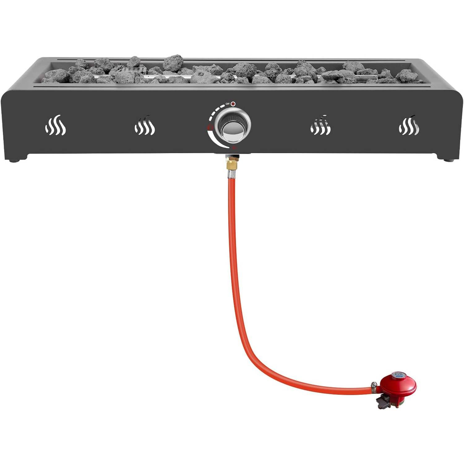 - Enhanced Safety Features: Includes a glass wind guard to shield the flame from breezes and a 3-metre hose for flexible propane tank placement, ensuring safe and convenient operation. And comes with 1.5 kg of lava rocks, enhancing heat retention and aesthetic appeal.
