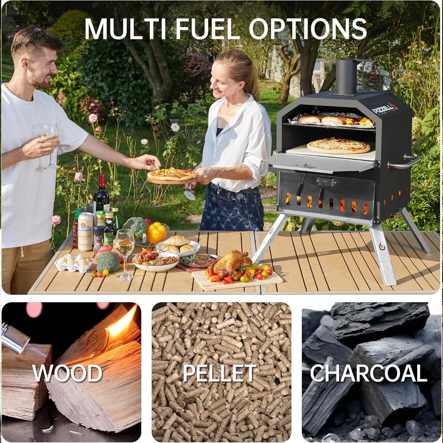 - 🍕 Wood-Fired Oven & Charcoal Smoker – Our pizza oven allows multi-fuel, charcoal, wood, and pellets, it can add new depths of flavor to your pizzas and smoked dishes. It is recommended to place the pizza stone on the lower level, where the temperature is higher than on the upper level.