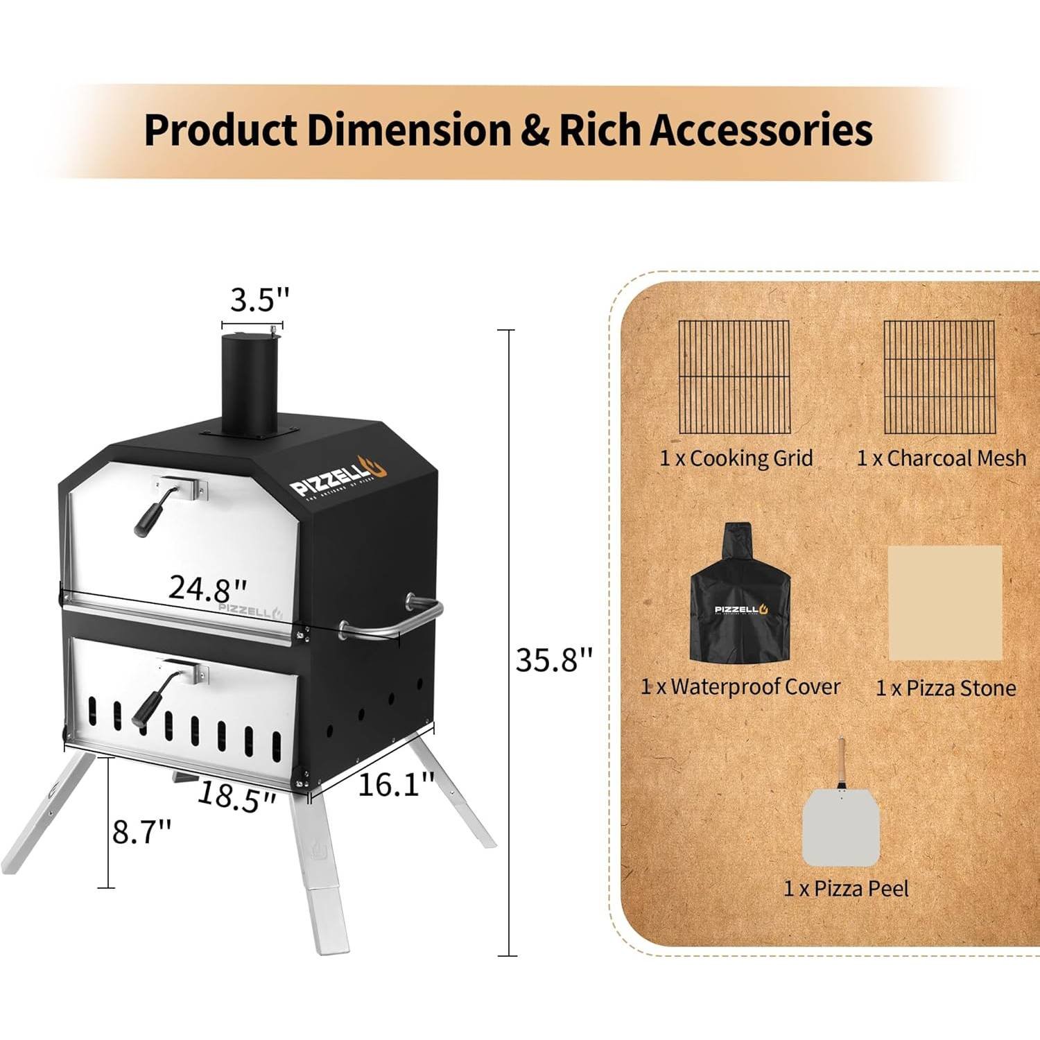 - 🍕Buy With Confidence – Super easy to finish the whole assembly. The Pizzello wood-fired pizza oven also comes with 2 x 16″ Grill Grates, 1 x Stainless Steel Pizza Peel, 1 x 16” Pizza Stone, 1 x Waterproof Cover. If there are any problems, such as missing parts, or damaged products, please feel free to contact us, and we will help to solve your problem ASAP!