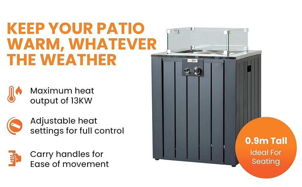 - Powerful Output – Extend your outdoor season at home or make use of the outdoor seating areas in your restaurant or bar with our garden heaters outdoors! This outdoor fire pit puts out 13KW and can be adjusted easily for the perfect level of cosy warmth. Fits 10kg/11kg/13kg gas cylinders (not included). Supplied with gas hose and 27mm clip on regulator.