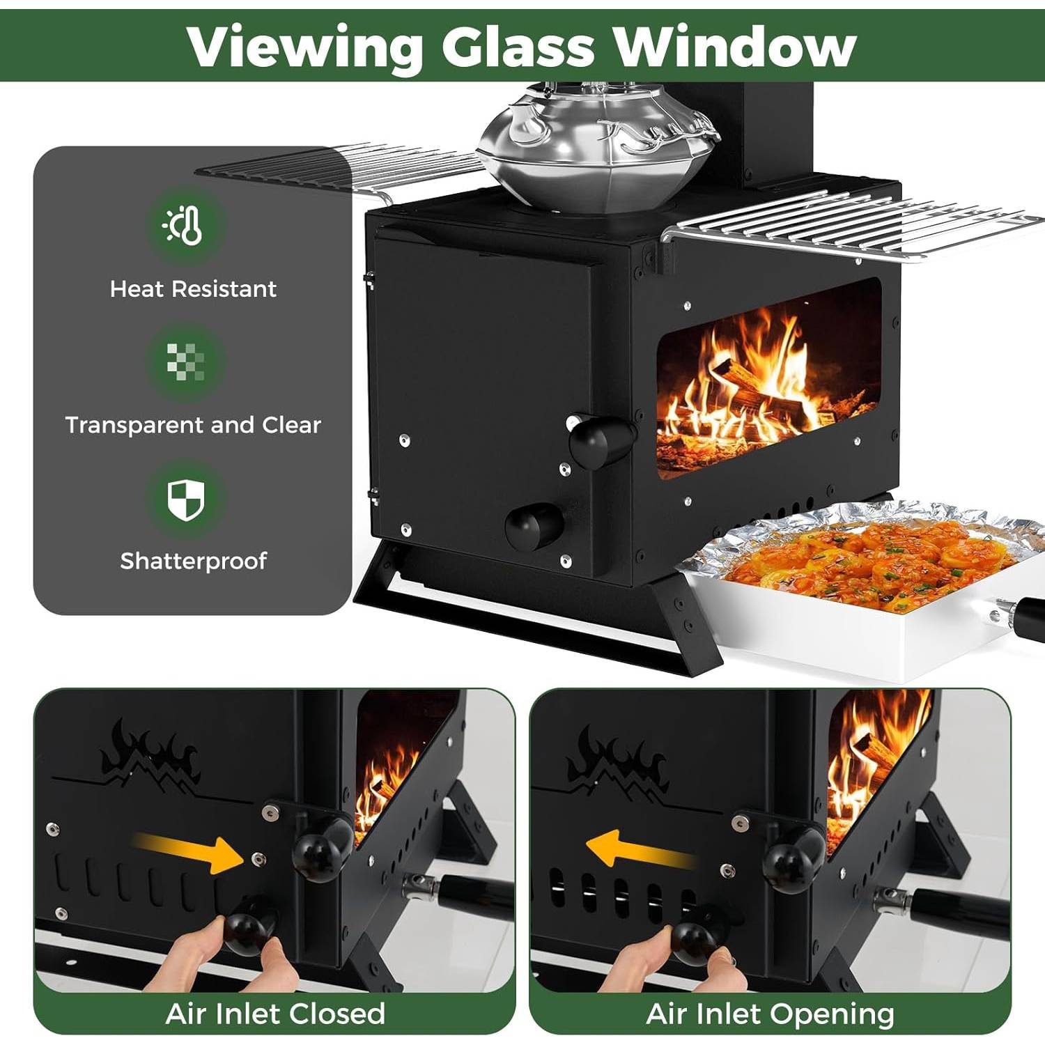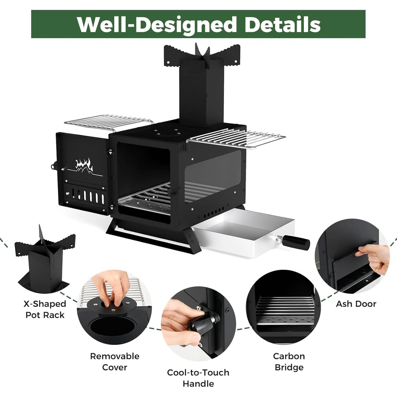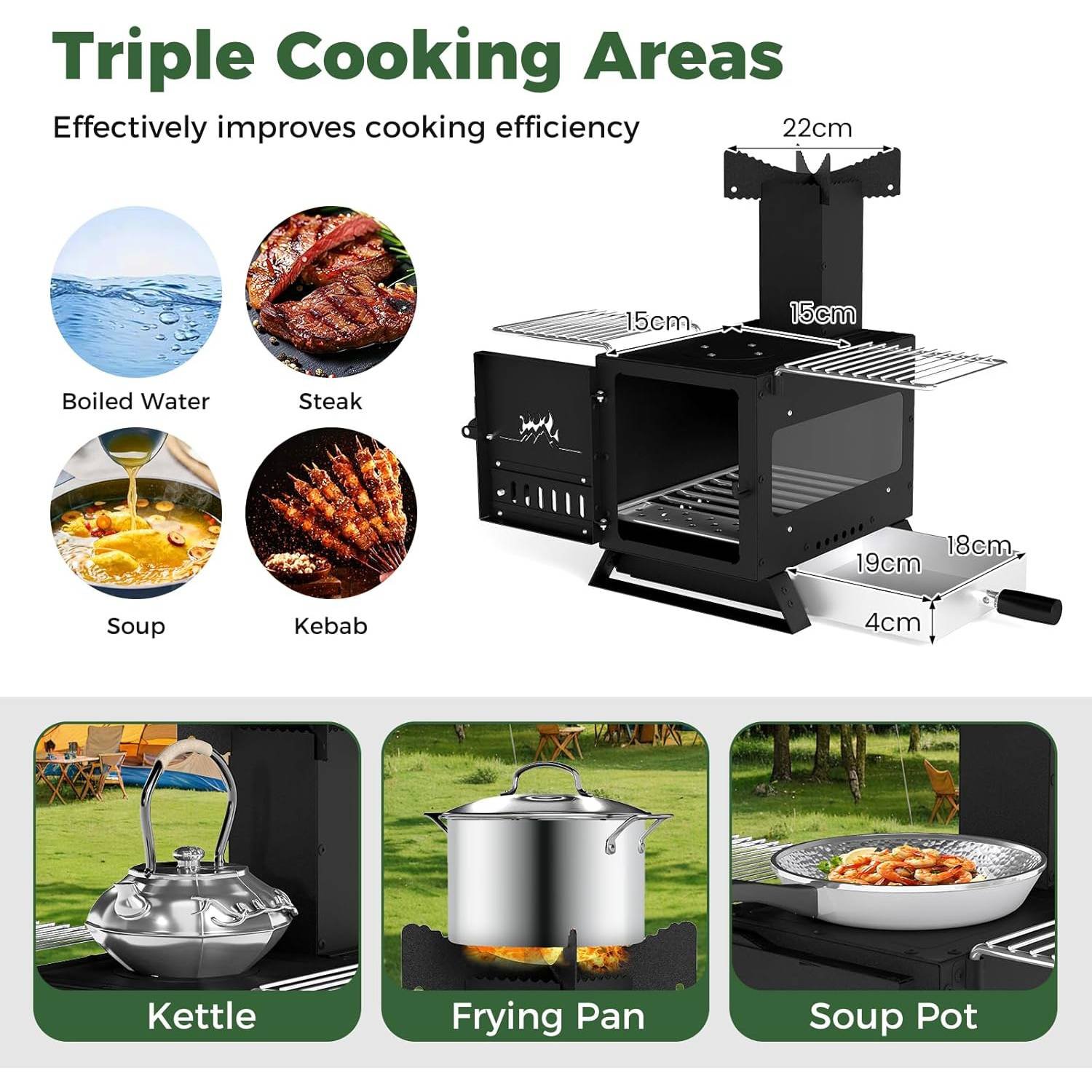 - DIVERSE COOKING POSSIBILITIES: This portable wood-burning stove features triple cooking areas, significantly enhances your cooking efficiency. The X-shaped pot racks are ideal for accommodating kettles, frying pans and soup pots while the bottom oven pan is skilled at cooking foil wrapped food.